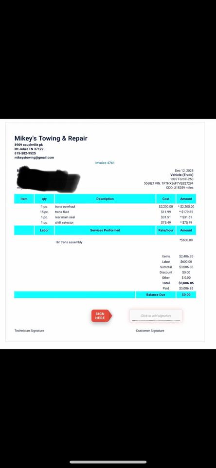 1997 Ford F-250 Supercab 4WD. 7.3L Powerstroke Turbodiesel V8. Automatic transmission. The transmission was just recently rebuilt last year with receipt. The truck runs an drives excellent. Plenty of power. Starts up easy. Nice body and interior. Solid truck from TN.